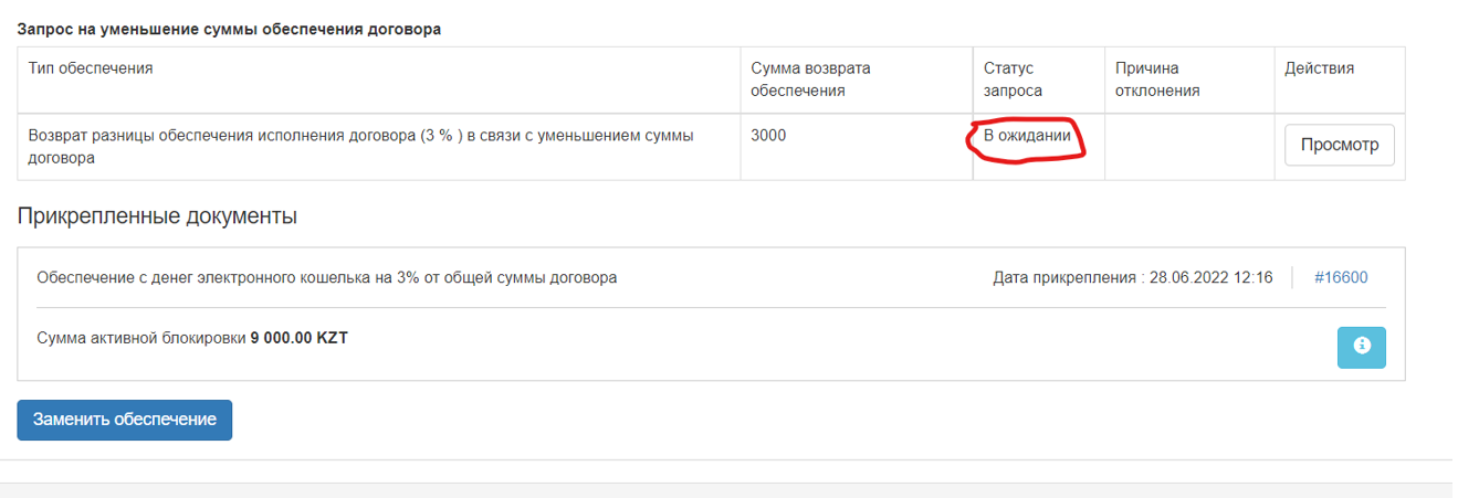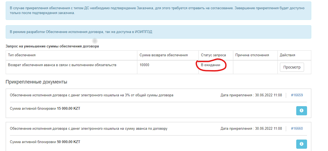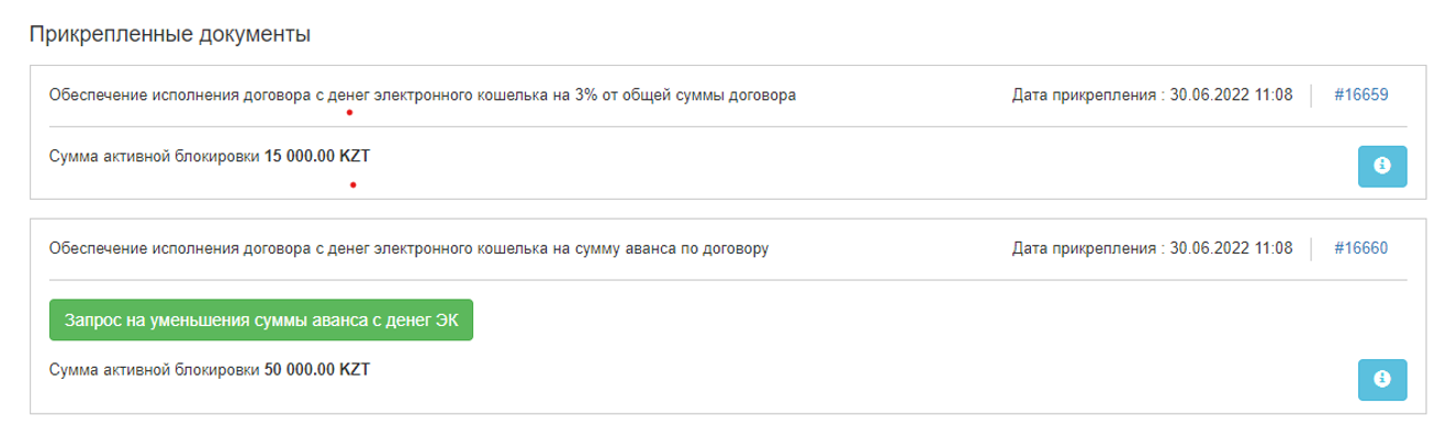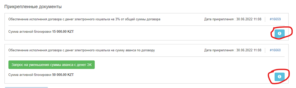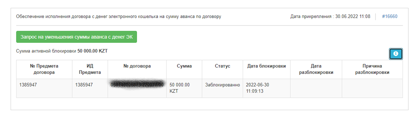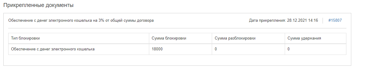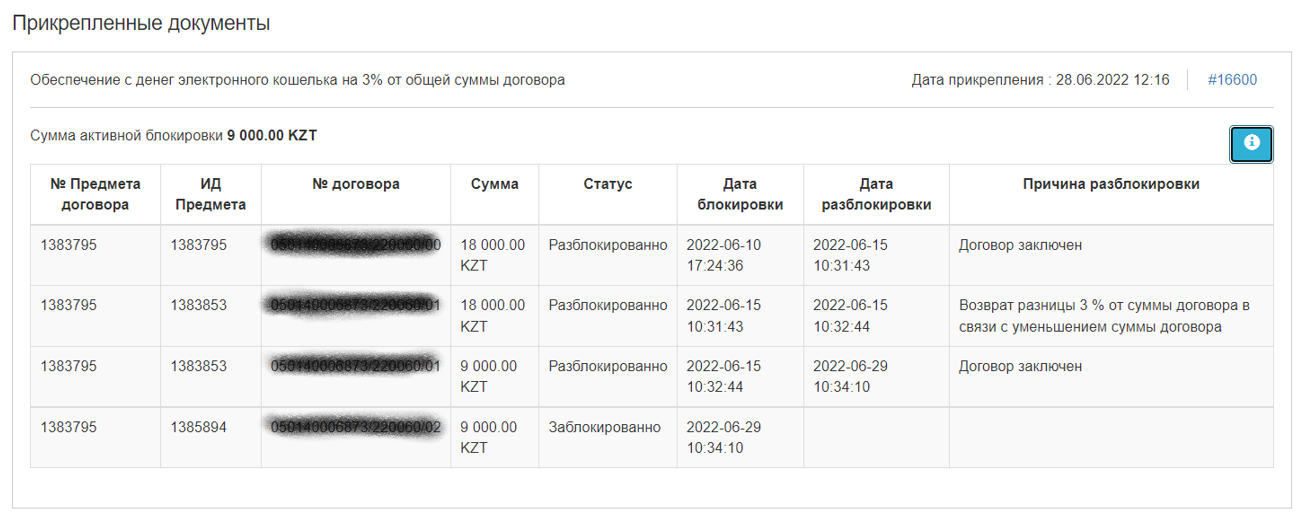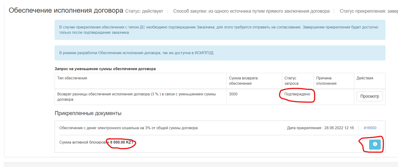 Внимание! Если сумма договора с тиынами, то Система блокирует с электронного кошелька сумму обеспечения исчисленную в тиынах без округления. При расчете, если в сумме обеспечения договора после запятой выходит больше двух знаков, то система будет округлять сумму до тиынов, при этом округление происходит всегда в сторону увеличения. Например, сумма договора = 525,35. Сумма обеспечения договора 3 % = 15,7635. Система округлит и заблокирует с электронного кошелька = 15,77. В пдф договоре сумма будет отображаться округленная в сторону уменьшения в этом случае, так как после цифры 7 идет 3, а если бы была цифра 5, то округление было бы в сторону увеличения. Т.е. может быть небольшая разница в тиынах. В итоге в пдф договоре будет отображаться сумма = 15,76, а заблокирована с ЭК будет сумма = 15,77. При разблокировке поставщику вернется сумма = 15,77. Чем больше количество предметов договора, тем больше будет разница в тиынах. Единый расчет для пдф договора и блокировки с кошелька технически невозможно. В связи с этим если выходит такая разница, то всегда будет с кошелька блокироваться в сторону увеличения. Чтобы со стороны заказчиков не было претензии к поставщику и с ним не расторгли договор. Так как Законом о ГЗ не запрещено предоставить обеспечение договора больше, главное не меньше. При этом отмечаем, что разница будет только в тиынах!
