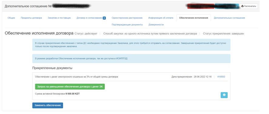 Шартты орындауды қамтамасыз етуді қоса тіркеу үшін Өнім берушіге шарт карточкасында «Шарттың орындалуын қамтамасыз ету» қосымша бетіне өту қажет.