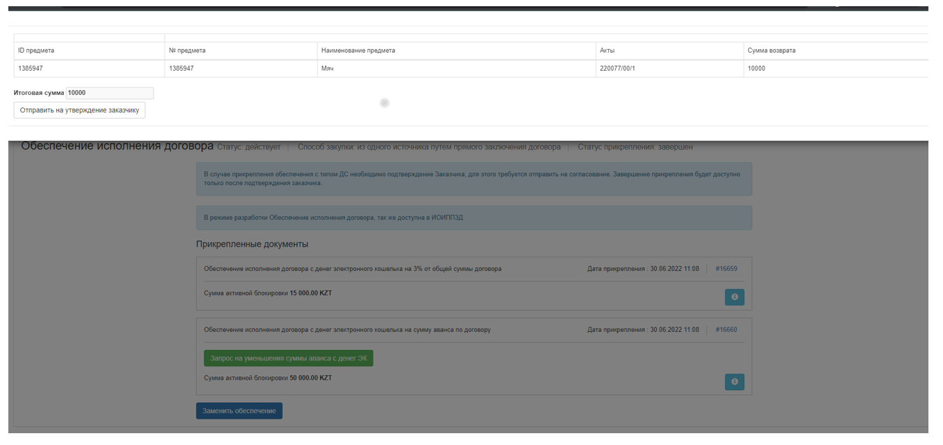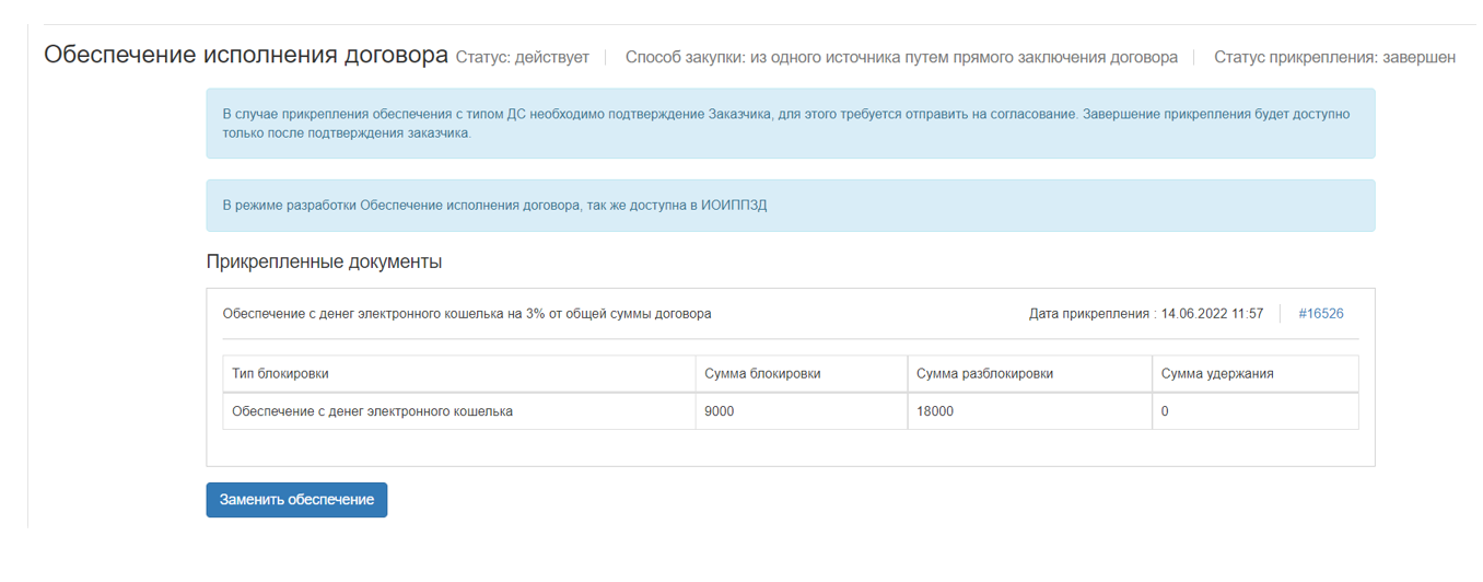 Внимание! При прикреплении обеспечения договора для текущего финансового года многолетних договоров либо при увеличении суммы договора для дополнительных соглашений, Система позволяет прикреплять только один вид обеспечения договора. Например, если в основном договоре для обеспечения исполнения договора либо обеспечения исполнения аванса было прикреплено обеспечение с денег электронного кошелька, то далее соответственно можно прикреплять с денег электронного кошелька, соответственно аналогичные требования применяются для электронной банковской гарантии и договора страхования. Для замены вида обеспечения договора необходимо воспользоваться функцией замены обеспечения.